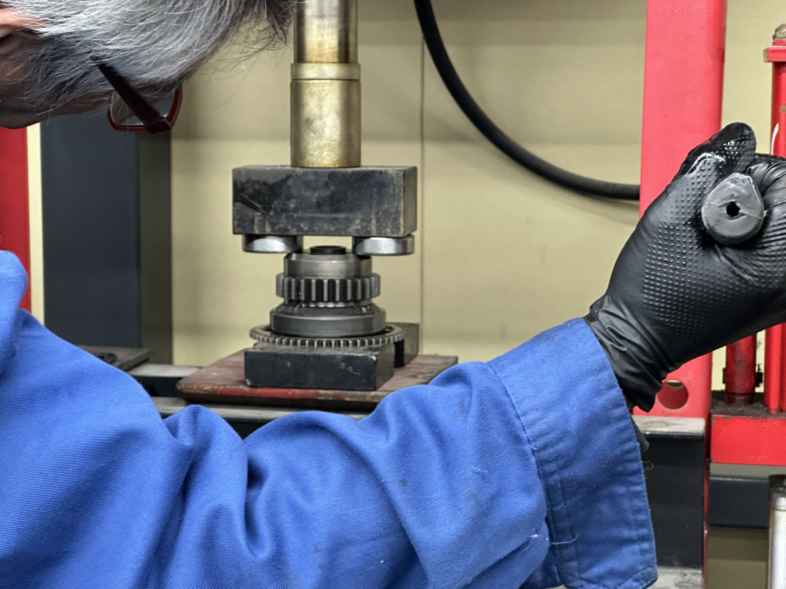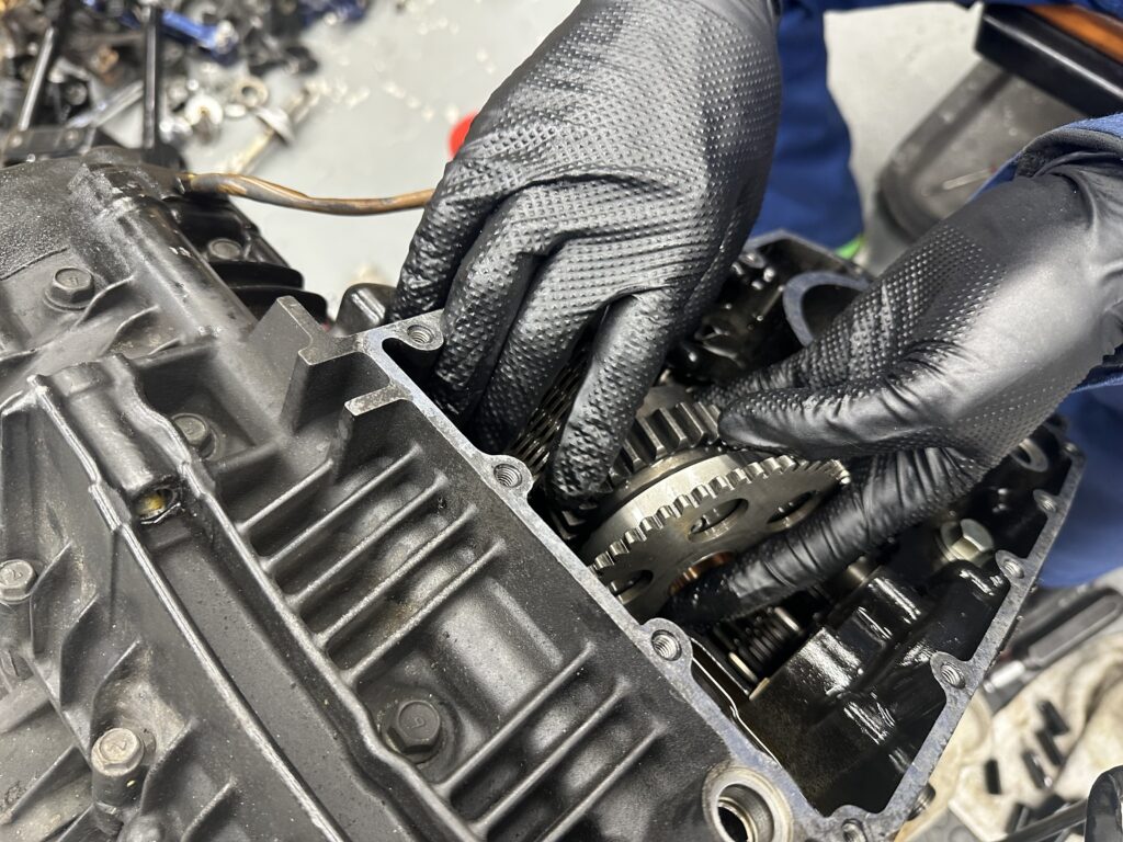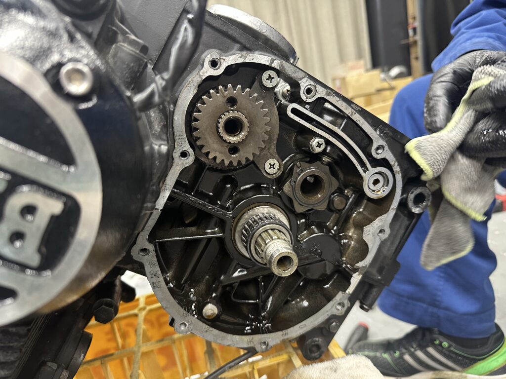 プレスでセカンダリーシャフトのカップリングをはめて、エンジンの中に知恵の輪のようにして入れていきます。