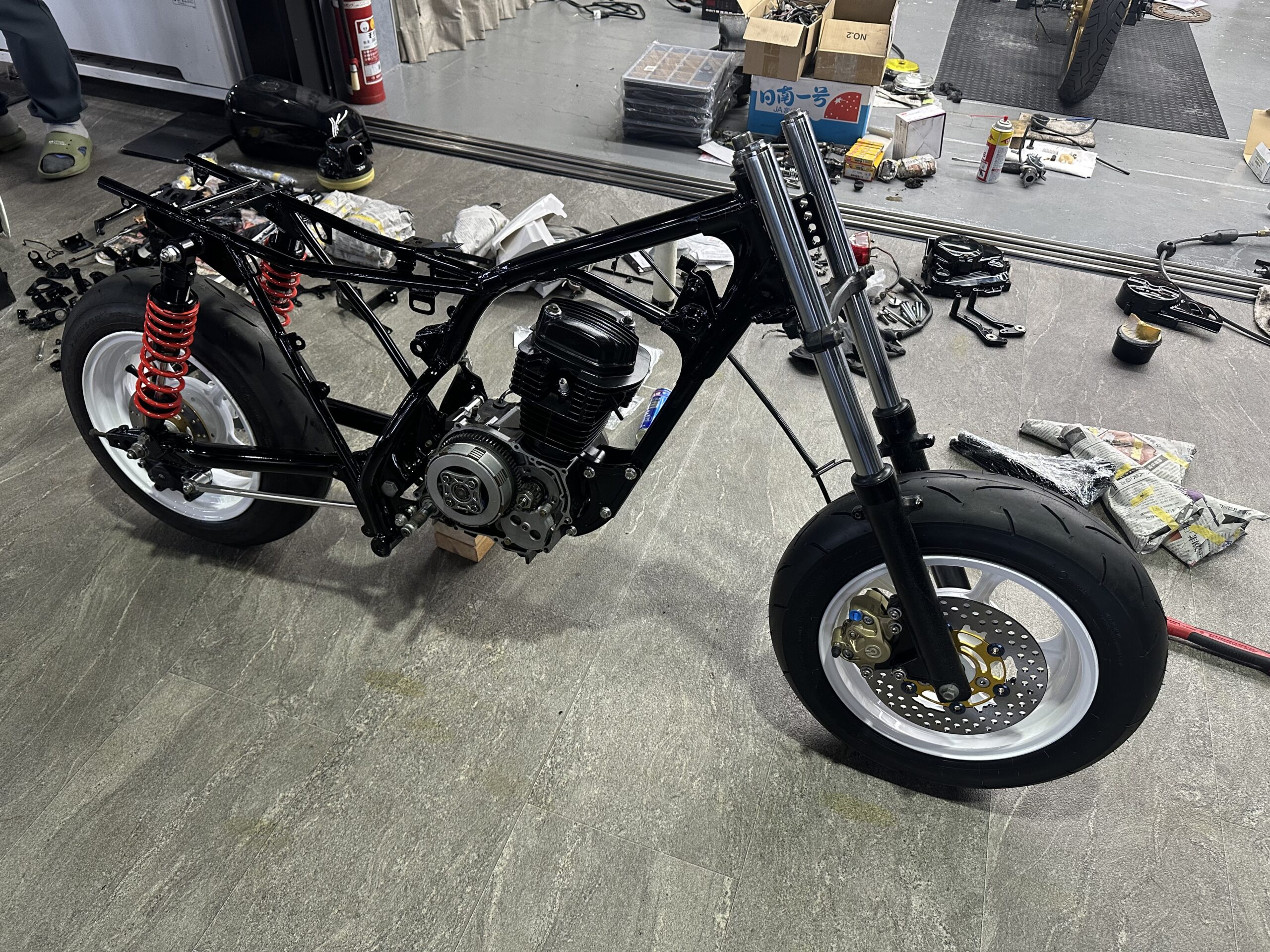 パウダーコートから返ってくる前に準備していたタイヤもつけてリア完成!