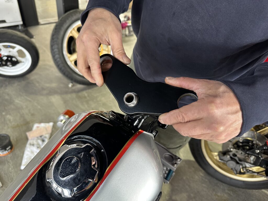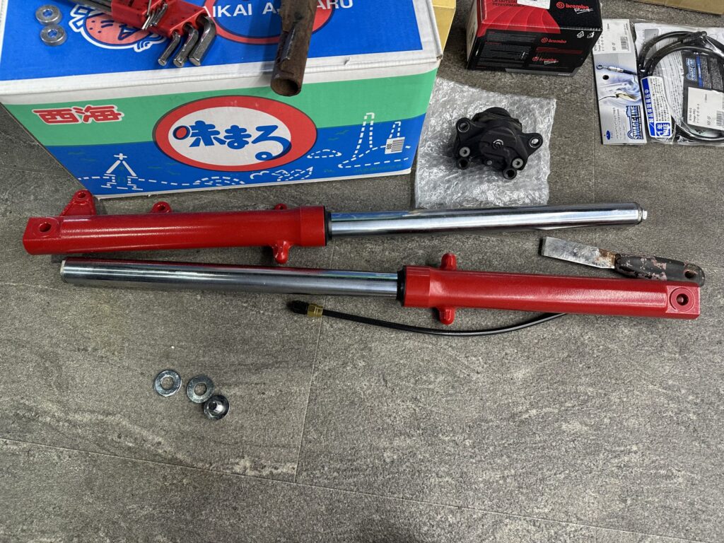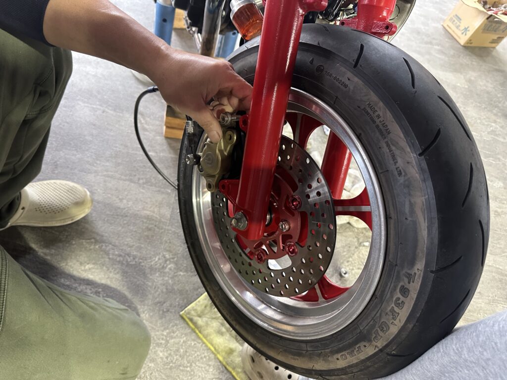 キャリパーとキャリパーサポートはこの間組んでいたエイプと同じで知恵の輪のようにして入れて組みます。